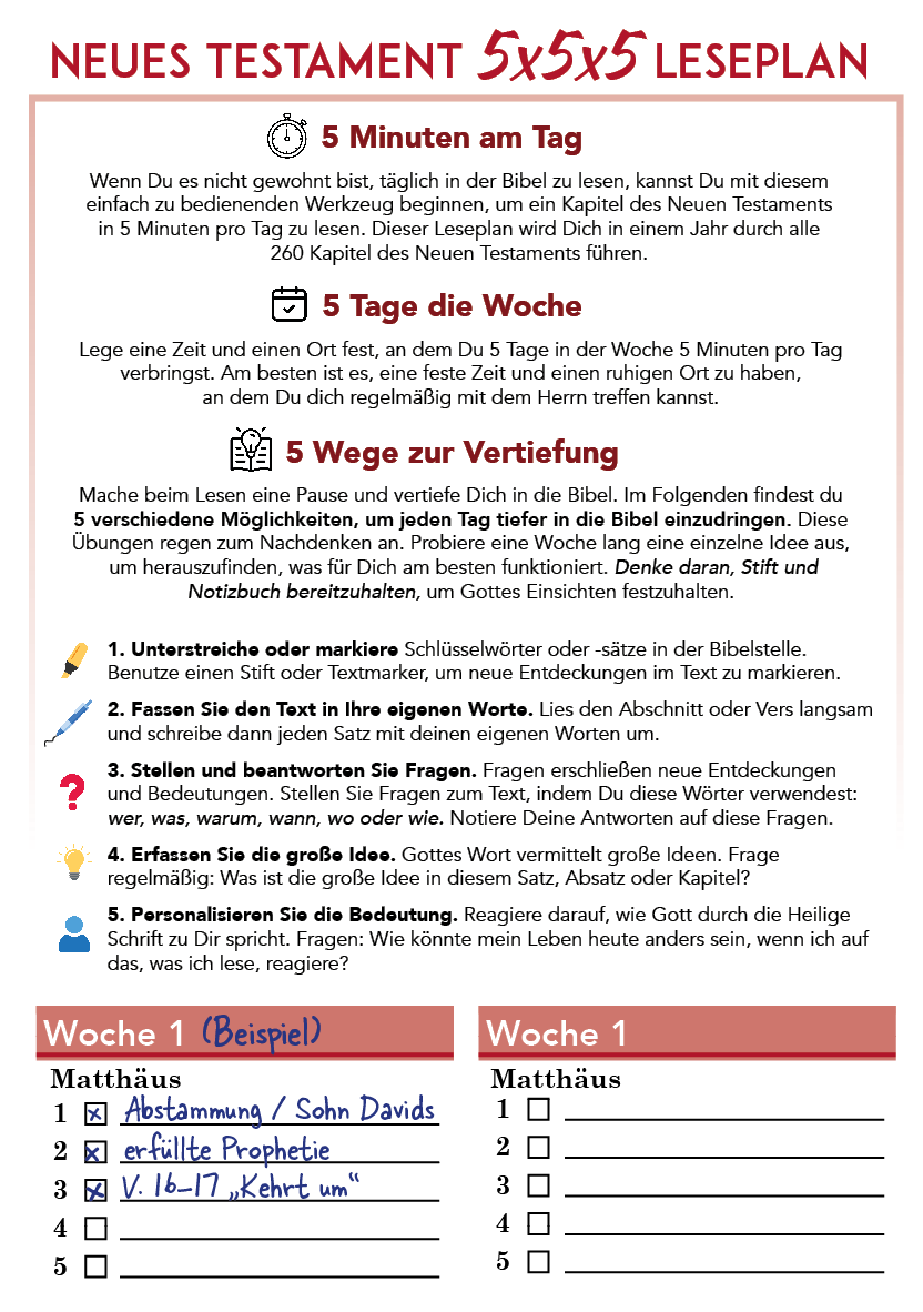 Das Neue Testament in 1 Jahr (5 Minuten, 5x die Woche) (A5 Booklet)
